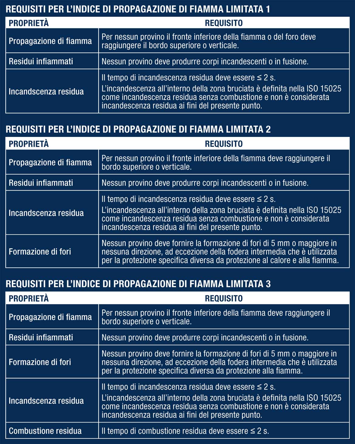 Sono specificati inoltre requisiti supplementari per gli indumenti.